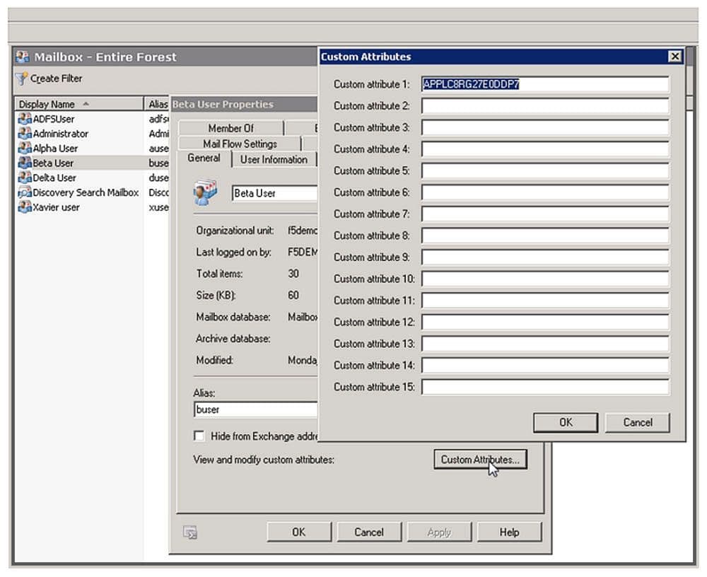 1. The custom attributes of the user mailbox are populated with acceptable device ID(s) for the specific user. For purposes of the following example, three devices may be assigned to a particular mailbox. Device IDs can be stored in "Custom attribute" 1, 2, and 3.
