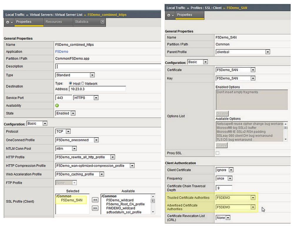 1. The current Client SSL Profile is modified to include a trusted certificate authority (CA) with a CA certificate previously imported into the BIG-IP system. In this example, the trusted CA is "F5DEMO."