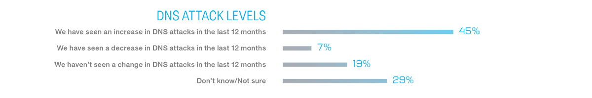 Because the number of connected devices is always increasing, service providers are still learning about the security requirements and challenges of the IoT and 5G networks. Safeguarding DNS remains a key part of any security strategy; almost half of survey respondents believe that DNS attacks are a growing concern.