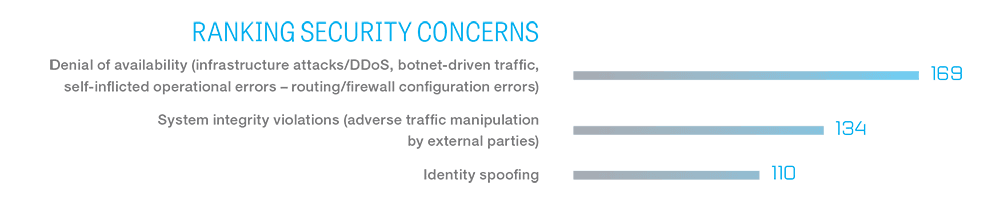 Hodges pointed out that the top security concern for service providers is outages caused by DDoS and botnet attacks. This fear is followed by threats related to system integrity in which traffic is manipulated by external attackers while spoofing a user's identity.