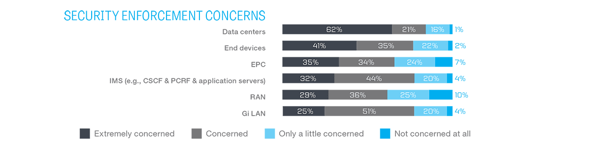 Service providers recognize that security threats exist across their network domains, with the top area of concern in the data center. But they also understand that devices, the RAN, the EPC, the IMS, and the Gi-LAN must be protected to ensure seamless, end-to-end network security.