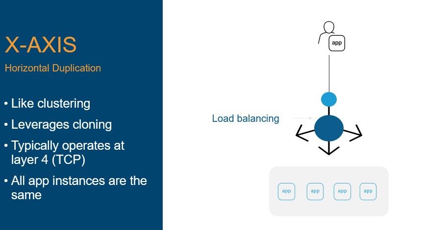 The X-Axis pattern is the most basic pattern. It is based on horizontal duplication and the bulk of the work is accomplished via a load balancing algorithm. It is the simplest pattern and results in what I call Plain Old Load Balancing (POLB).