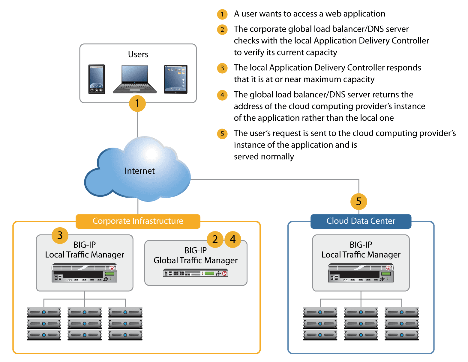 F5 extends data center capacity and resource availability by seamlessly virtualizing all application resources—internal and external—and presenting them as a single resource. The pool of resources that provides the capacity to scale an application can be virtual, physical, local, or remote. F5 can redirect users to additional resources that provide capacity on demand. When demand decreases, the resources are released, helping to reduce costs for customers who have adopted a pay-per-use model. The F5 solution understands the network and application contextually in real time and can determine the best resource to deliver the request, ensuring high availability for applications delivered from the cloud.