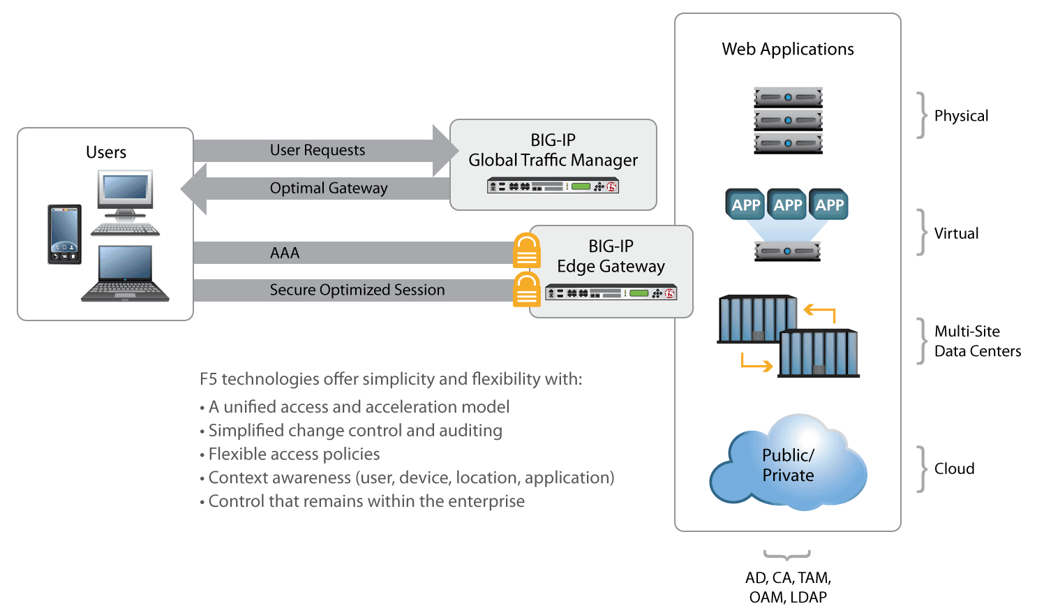 F5 solutions provide simplified user access and strong security by federating the authentication at a single location for both enterprise and cloud resources. This eliminates the need to manage multiple point solutions for security and access control, resulting in considerable cost savings and simplified management.