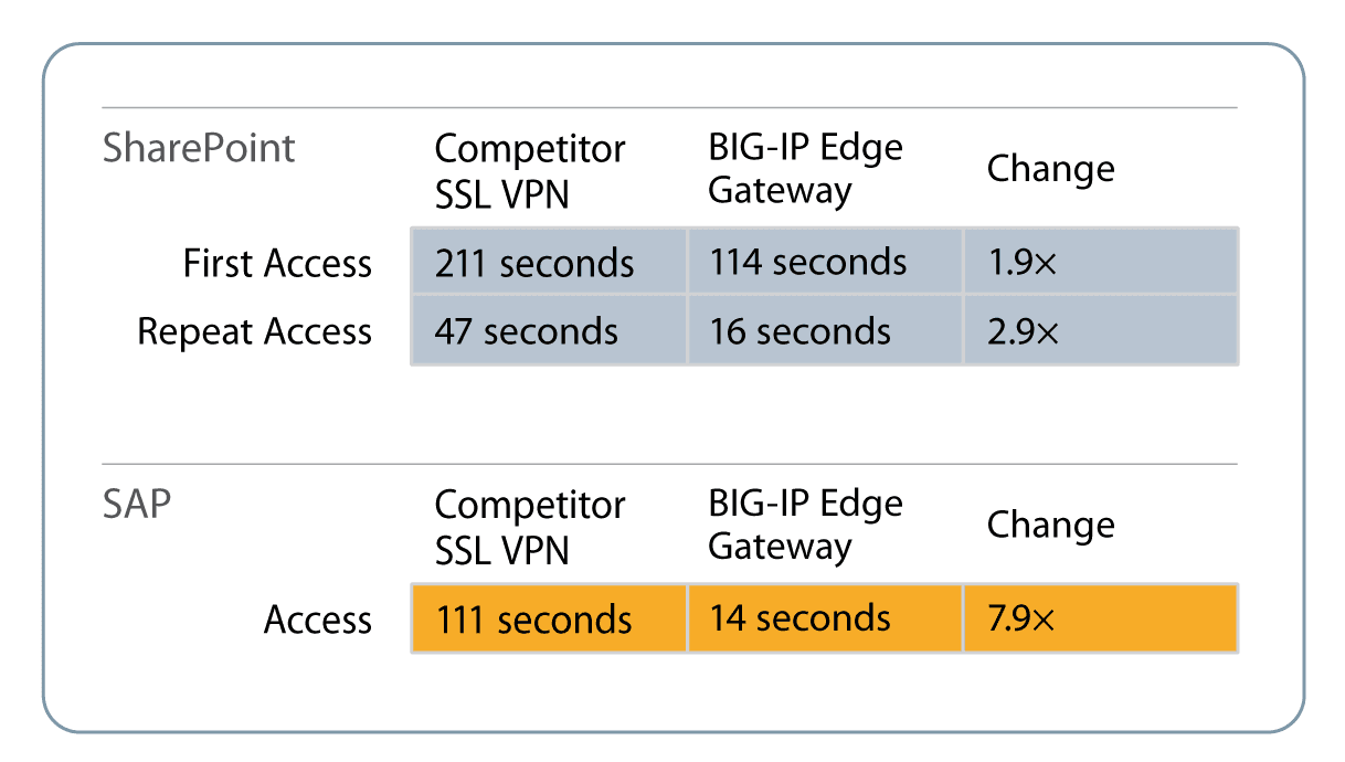 F5 solutions come with prebuilt authentication policies that greatly reduce the complexity of deployment and time to service. By providing a unified point of enforcement, F5’s integrated solution simplifies auditing and enables IT to control changes in application access control configurations — offering a superior user experience and increasing productivity.