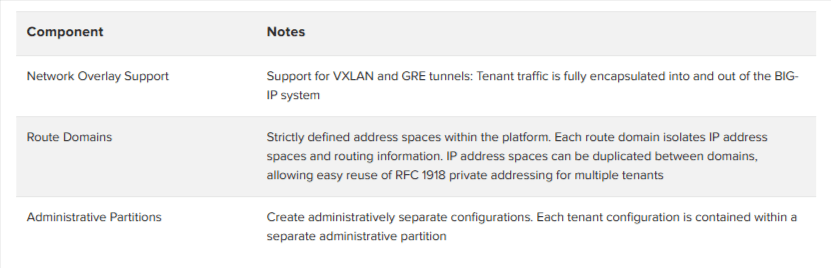 F5 hardware platforms offer high performance and massive scalability for environments requiring a large number of clients or tenants or high throughput use cases. A single HA pair can service many hundreds of tenants and millions of clients. F5 hardware devices provide connection rate service level agreements (SLAs) and significant offloading for the underlying compute environment through the use of specialized hardware for both SSL and TCP processing. Where network security services and distributed denial-of-service (DDoS) mitigation is required, F5 hardware platforms offer excellent performance and high levels of protection. Support for multiple overlapping address spaces and network overlay protocols enables hardware devices to be used in most multi-tenant environments.