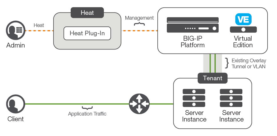 The F5 Heat plug-in allows Heat templates to create advanced application delivery configurations on any BIG-IP device or virtual edition with network access that is reachable from the server running the Heat service. The BIG-IP instance will also need connectivity and routing to the tenant instances, as that connectivity is not configured by the Heat plug-in.