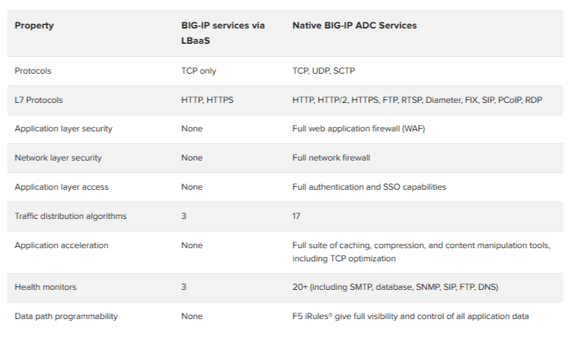 LBaaS provides a simple, API-driven system to deploy load balancing services within OpenStack, providing basic load balancing for a large number of clients. The API does, however, deliver only a subset of the functions of a comprehensive Application Delivery Controller (ADC). This table compares LBaaS and native BIG-IP services across some key application delivery properties such as protocol support, additional services, and health monitors.
