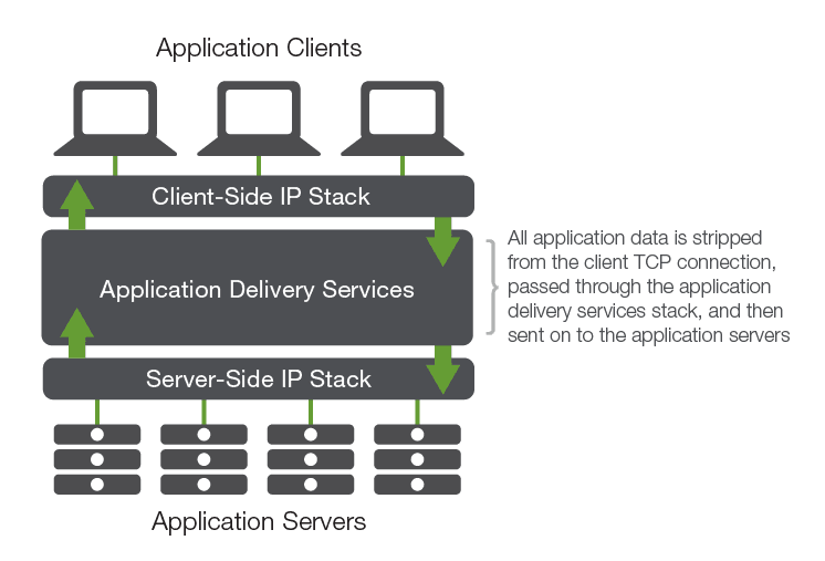 Clients connect to the BIG-IP device or instance, which connects to back-end servers (or in some cases, such as DNS services, handles the application traffic and responds back to the client directly). This creates a TCP “air gap,” with complete TCP session regeneration between the client and the server. Within this logical gap, the BIG-IP platform provides application delivery services. As application traffic transits the platform, it can be inspected, altered, and controlled, so the BIG-IP platform gives complete control of both inbound and outbound application traffic.