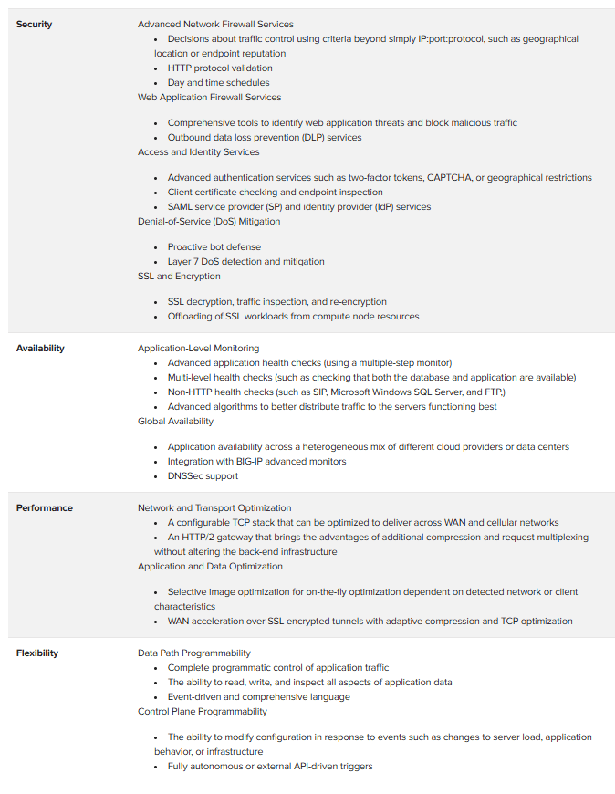F5 products provide a spectrum of advanced application delivery services that are designed to provide scalability, availability, and multi-layered security. Some key (but not exhaustive) examples include: