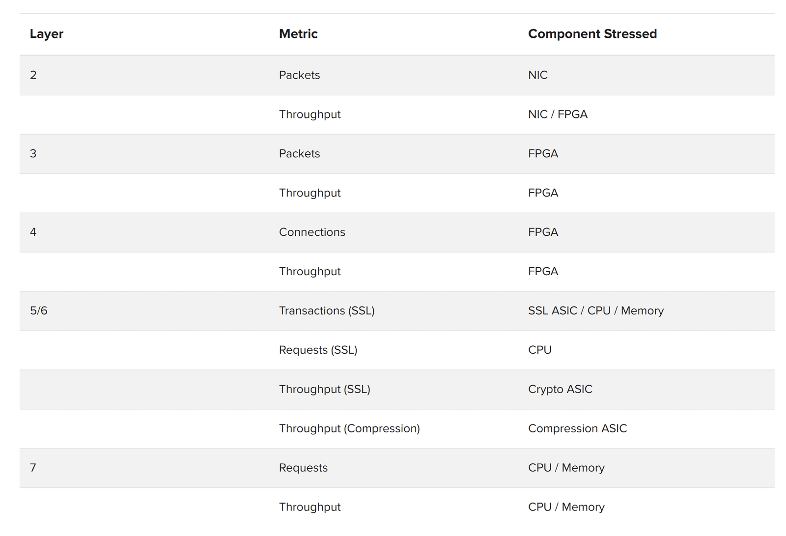 The packet metric states how many packets per second the ADC can process, and the components most stressed by this processing vary by layer. For example, processing layer 2 packets primarily stresses the Network Interface Card (NIC), while processing layer 4 packets primarily stresses the FPGA. The throughput metric on all layers refers to total available throughput in gigabits per second, while the connections metric measures how many connections per second can be made at that particular layer. For example, the layer 4 connection metric measures how many TCP connections can be established per second.