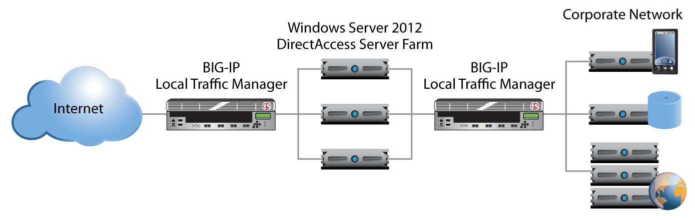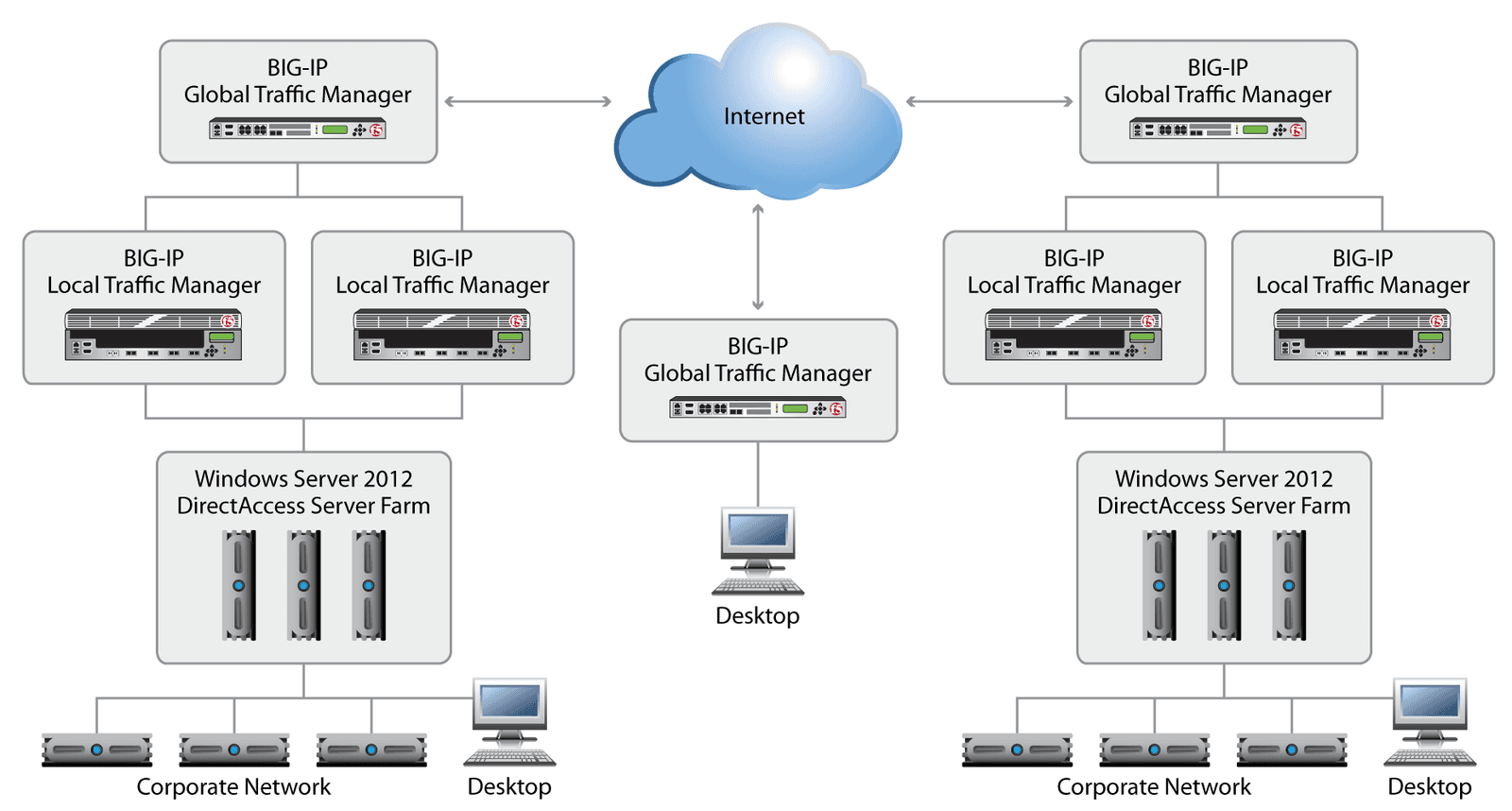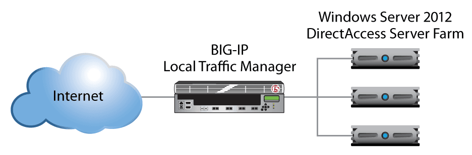 New to DirectAccess in Windows Server 2012 is support for both local and wide area load balancing. F5 BIG-IP Local Traffic Manager (LTM) can be used to provide local area load balancing, and F5 BIG-IP Global Traffic Manager (GTM) can provide the wide area (a.k.a. global) load balancing.