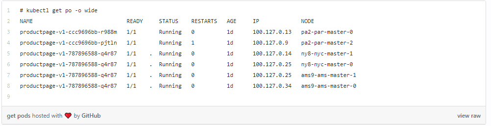 The following output shows 2 pods running in each location with mapping to particular physical node