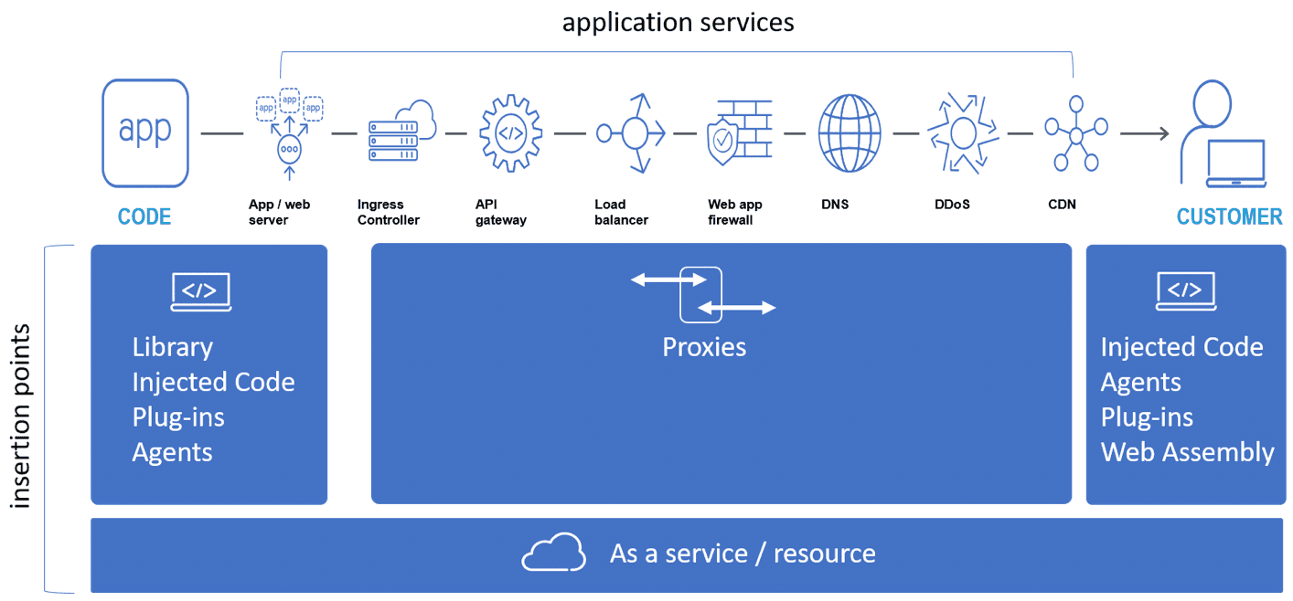 Because not all applications and environments offer that access (think SaaS), we look to alternative insertion points where application services might be deployed. We loosely call these alternative points "proxyless" because they do not require or rely on a proxy for deployment and execution. These services may take the form of traditional agents—software deployed as part of the server or application—or they may take a more developer-friendly form of code-based options. Injected code such as JavaScript libraries or web server and browser plug-ins are good examples of insertion points in these alternative locations.
