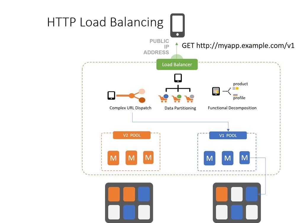 HTTP load balancing enables patterns like API versioning, where the API version is embedded in the URI (or in a custom HTTP header). The load balancer is able to separate out versions and ensure clients are sent to the correct back-end service for execution. This always graceful migration of clients in situations where you can’t force-upgrade.