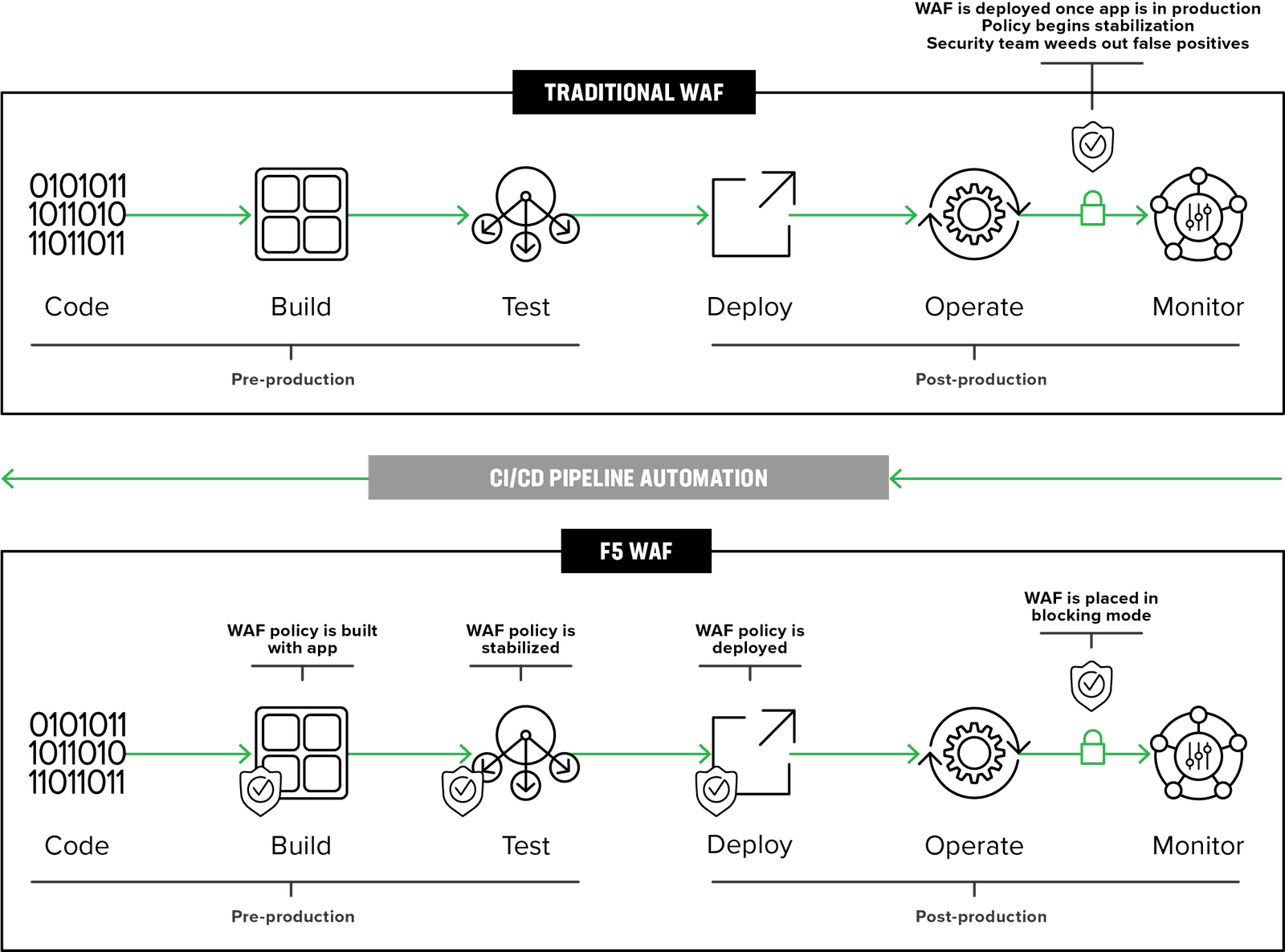Contemporary development processes are based on continuous integration/continuous development (CI/CD) principles, where security controls—especially WAF—are often placed at the end or out of the Software Development Life Cycle (SDLC). So, if DevOps runs into a failed test at the “Operate” stage, it’s treated as a security misconfiguration. This can create tension between DevOps and SecOps (once again) and force DevOps to go back to the code, repair it, and then again press onward to deploy, operate, and monitor—missing time to market and reducing competitive advantage.