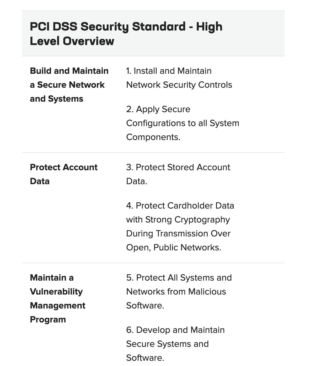 PCI DSS comprises a minimum set of requirements for protecting account data and may be enhanced by additional controls and practices to further mitigate risks. The below table lists the PCI DSS requirements at a high level, F5 qualifies as Level 1 Service Provider and while it does not process, store, or transmit CHD/SAD; it could impact the security of the cardholder data environment (CDE) of our customers.
