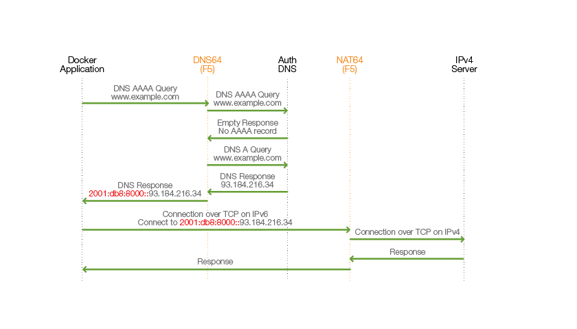 In the example shown in Figure 5, NAT64 and DNS64 services have been provisioned (again, in any form, physical or virtual). The Docker container attempts a connection to www.example.com, for which, in this example, no IPv6 address exists.