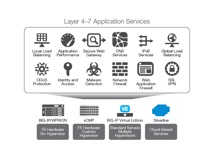 F5 offers a range of products to enable virtualization. As the ADC market leader with the broadest portfolio of L4–L7 application delivery and security services in the industry, F5 is constantly exploring innovative technologies and extending these technologies across BIG-IP platforms, since they all share a common underlying framework. Figure 4 shows the range of F5's product offerings, from custom hardware to complete cloud-based as-a-service offerings for L4-L7 services. The BIG-IP platform is well positioned to support applications running on Docker containers.