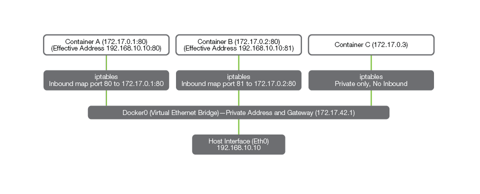 The host interface (Eth0) is exposed using another address (in this case, another RFC1918 address, 192.168.10.10). Each Docker container is assigned an address in the 172.x.x/16 space automatically when it is started. In order for a container to communicate to entities outside of its host in a bidirectional fashion, it must be assigned an explicit set of rules through iptables.