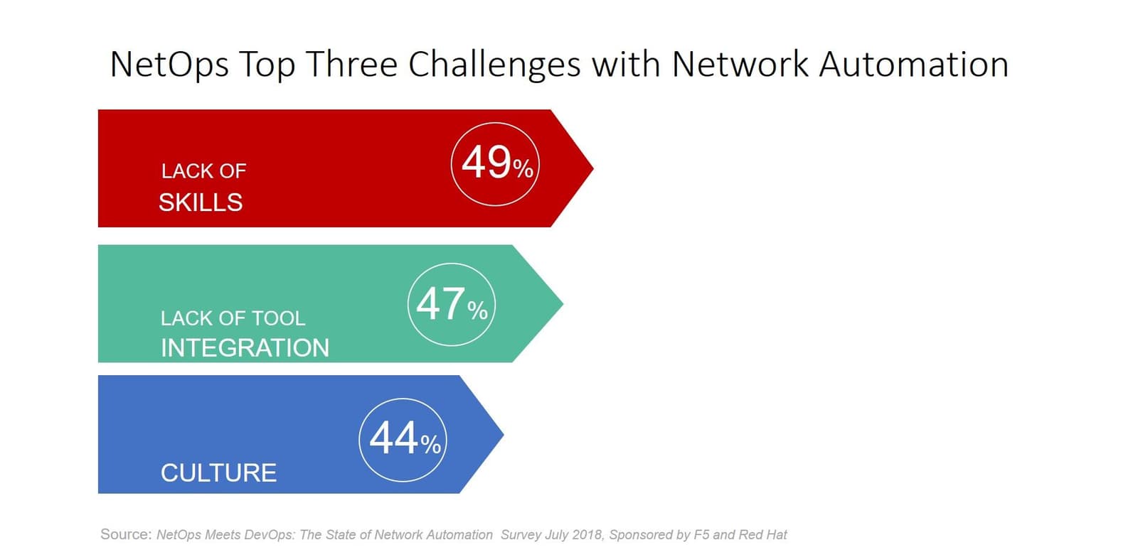 It is no surprise that lack of tool integration would be considered a challenge, given that the number one obstacle facing NetOps is a lack of "DevOps" skills. Typically these include development skills not traditionally associated with NetOps professionals. Integration, for the most part, requires exactly these skills. Even though NetOps are largely comfortable with command-line invocation of web and API-based protocols, this does not imply the ability to develop the systems necessary to integrate tools and technologies.
