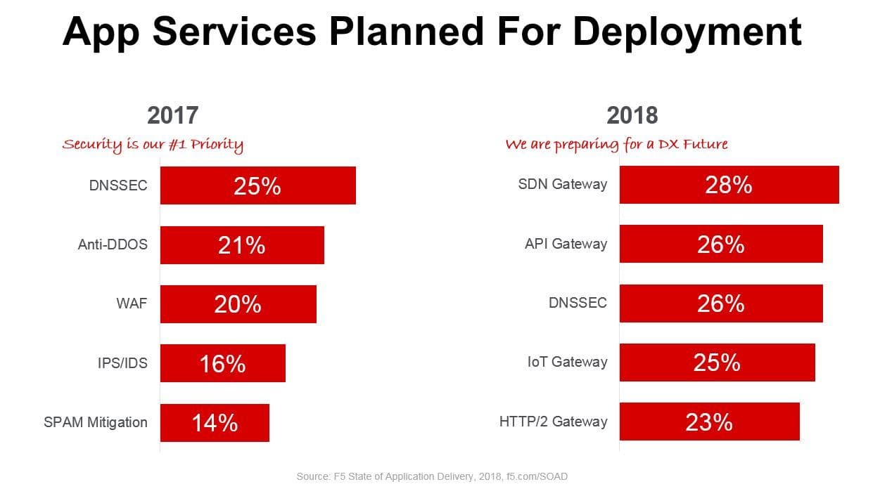 Four years ago, with an American English-speaking audience we were able to have a little fun and ask the respondents to complete the following sentence “I would rather eat worms than deploy an application without____.” At that time, 40% reported they couldn’t do without availability services – nothing else mattered if the app wasn’t up and performing. As we went global, the question changed- “the worst thing I could do is deploy an application without_____.” And the answer has shifted, too: It’s been a race to the finish, but last year security moved ahead of availability. And this year, that lead was extended with 43% of respondents declaring the worst thing they could do was deploy an app without security services. Availability still garnered a respectable 33%, the same as in 2017, and 1% higher than in 2016.