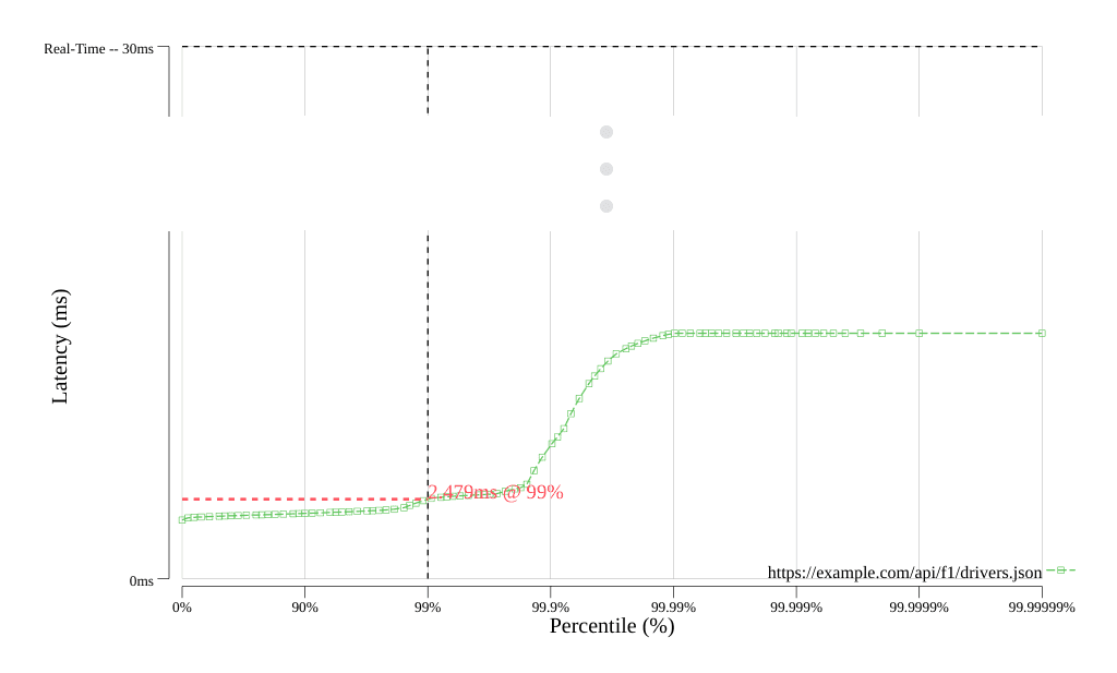To highlight the results for your API, the dashed lines that are parallel to the axes intersect to show your API’s measured latency at the 99th percentile (99% on the graph). For your API to be considered real time, the latency at the intersection needs to be less than 30ms.