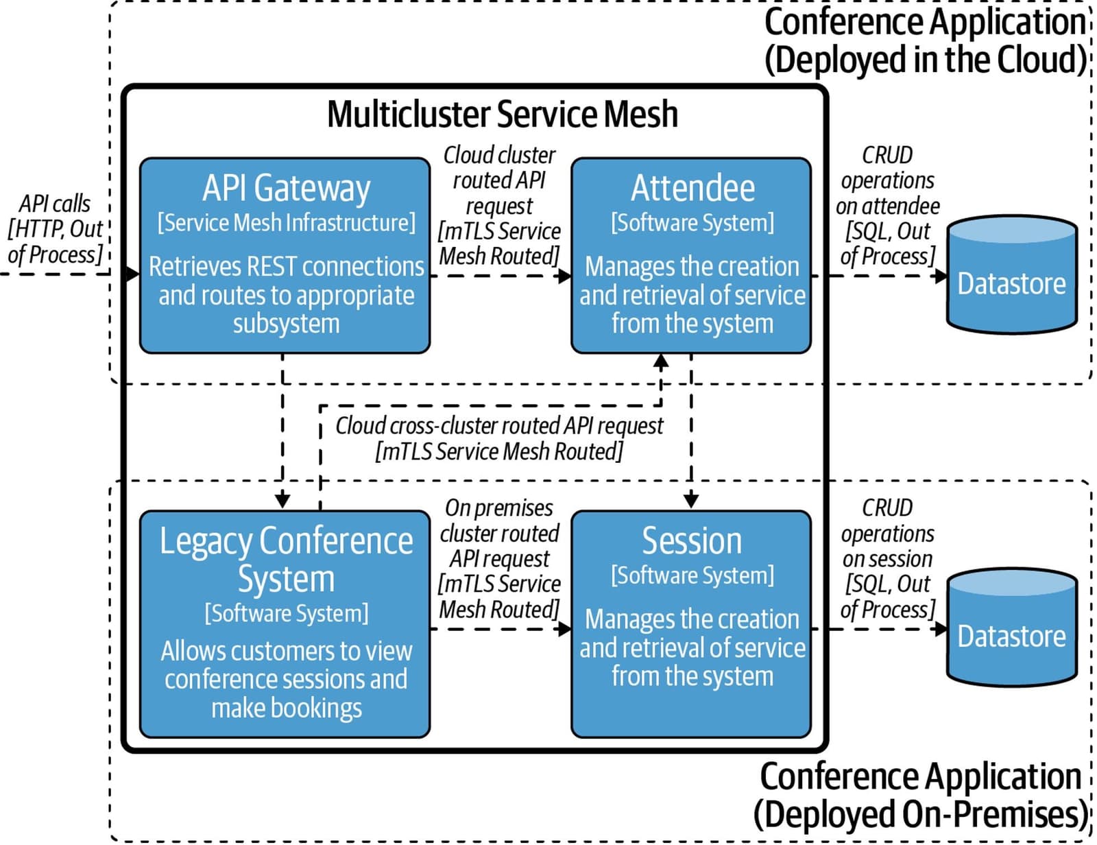 Next, a service mesh is provisioned to repurpose the Sessions functionality from the legacy conference system into a new Session service. A service mesh provides fine-grained control of routing, ensures reliability, and efficiently brokers traffic for service-to-service API communication to facilitate viewing and booking of an Attendee’s sessions: