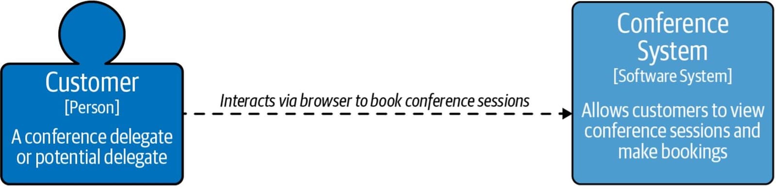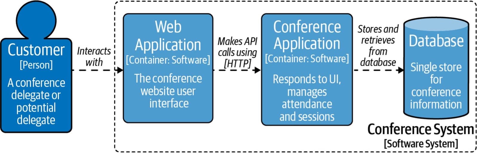 In our hypothetical example, a conference system supports functions such as creation of an Attendee account (create account), review of available sessions (review sessions), and booking attendance (book sessions). The customer interacts with the conference system via a web browser. For example, to book a conference session: