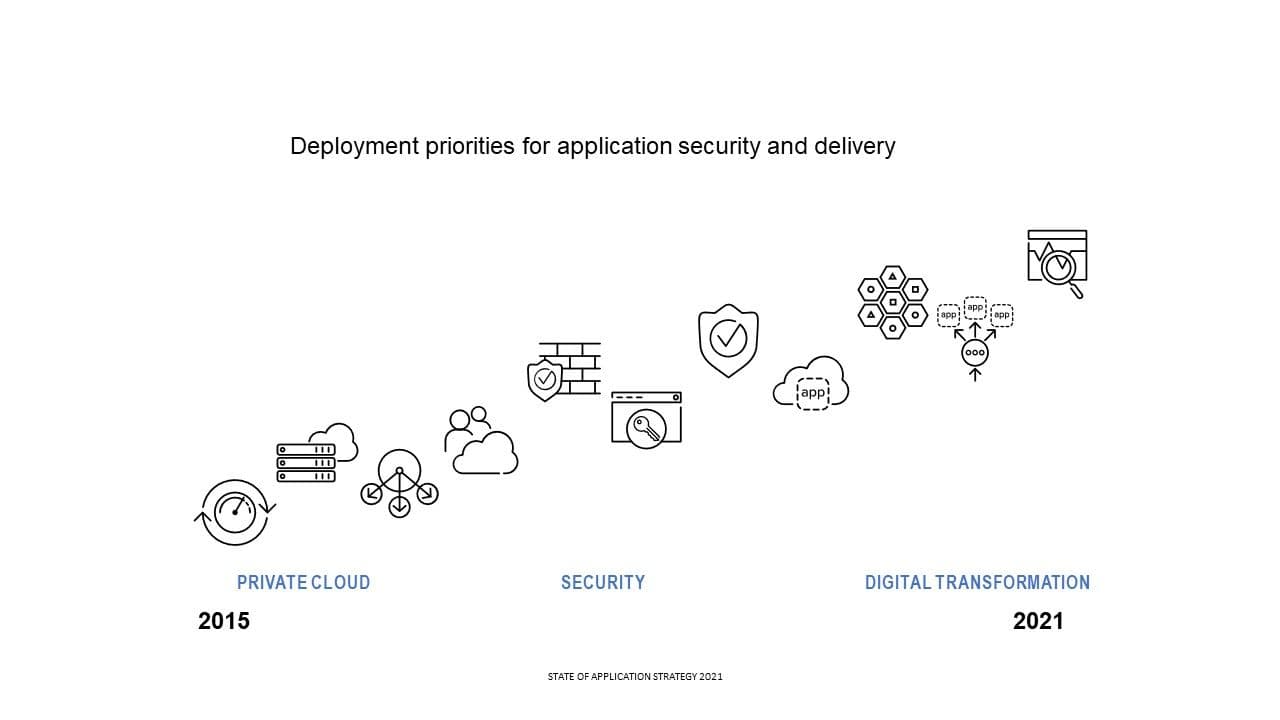 In the last seven years of our research, we have found that application security and delivery deployments mature and expand in lock-step with related digital transformation technology shifts such as application modernization, cloud, automation and, more recently, AI. Every year the top application security and delivery technologies planned for deployment indicate the strategic priorities of the coming year and how organizations are progressing through digital transformation. In 2015, the top strategic IT trend was private cloud, and organizations were starting to think about the growing challenges of delivering applications securely in a multi-cloud operational model. The top application services reflected this trend with DNSSEC, Global Server Load Balancing, and Identity eFderation topping the list. A couple of years later, the impact of security breaches reached the C-suite and respondents were prioritizing security technologies that protected the network, application, and user endpoints. DDoS, WAF, IPS/IDS, and Spam Mitigation led the list of planed technologies in 2017. In 2018, we started to see organizations preparing for digital transformation with SDN, API, and IoT Gateways emerging.