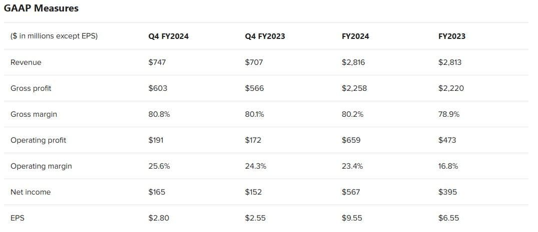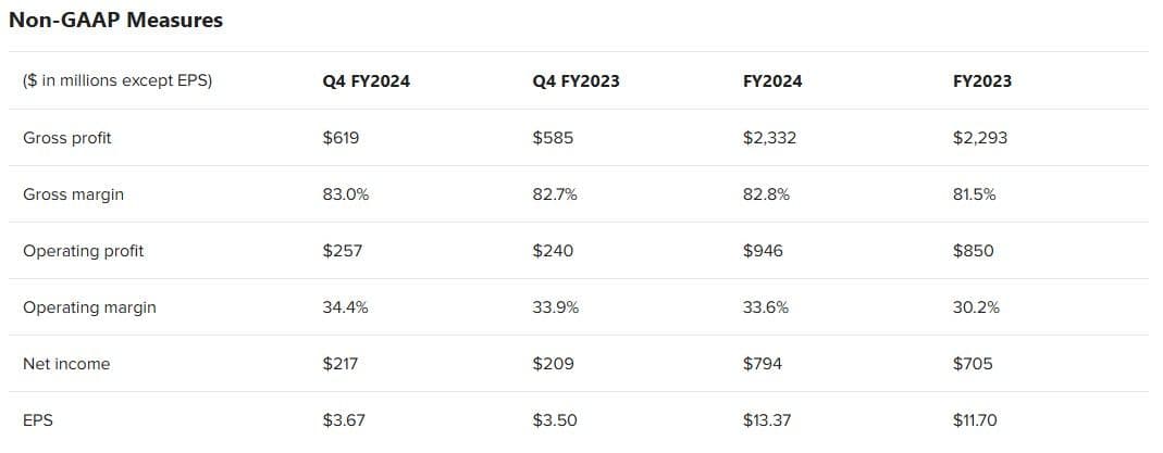 GAAP gross profit for the fiscal year 2024 was $2.26 billion, representing GAAP gross margin of 80.2%. This compares with GAAP gross profit of $2.22 billion in the year-ago period, which represented GAAP gross margin of 78.9%. Non-GAAP gross profit for fiscal year 2024 was $2.33 billion, representing non-GAAP gross margin of 82.8%. This compares with non-GAAP gross profit of $2.29 billion in the year-ago period, which represented non-GAAP gross margin of 81.5%.