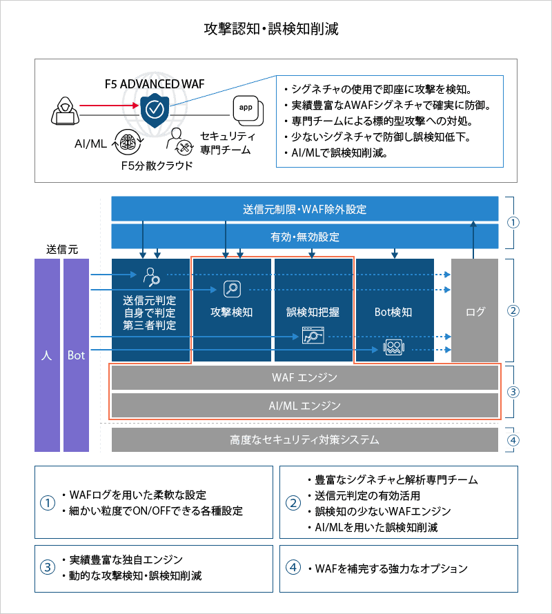 攻撃者からの攻撃を水際でブロックするWAFなど、Webアプリケーションの脆弱性を狙った攻撃を防止するソリューションを提供。WAFの基本的な機能だけでなく、DDoS攻撃防護、Bot管理やAPI保護などを組み合わせることもできますし、ロードバランサーと統合した形での活用も可能です。