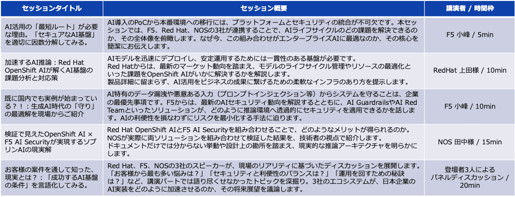 本ウェビナーでは、Red Hat OpenShift AIによる高度な推論基盤の構築と、F5のAI Red Team/Guardrailsによる鉄壁のセキュリティ保護を、ネットワンシステムズ(NOS)の実践的な検証結果と共に公開します。3社の知見を結集し、机上論ではない「現場で動く、安全なAI活用」の最適解を提示します。