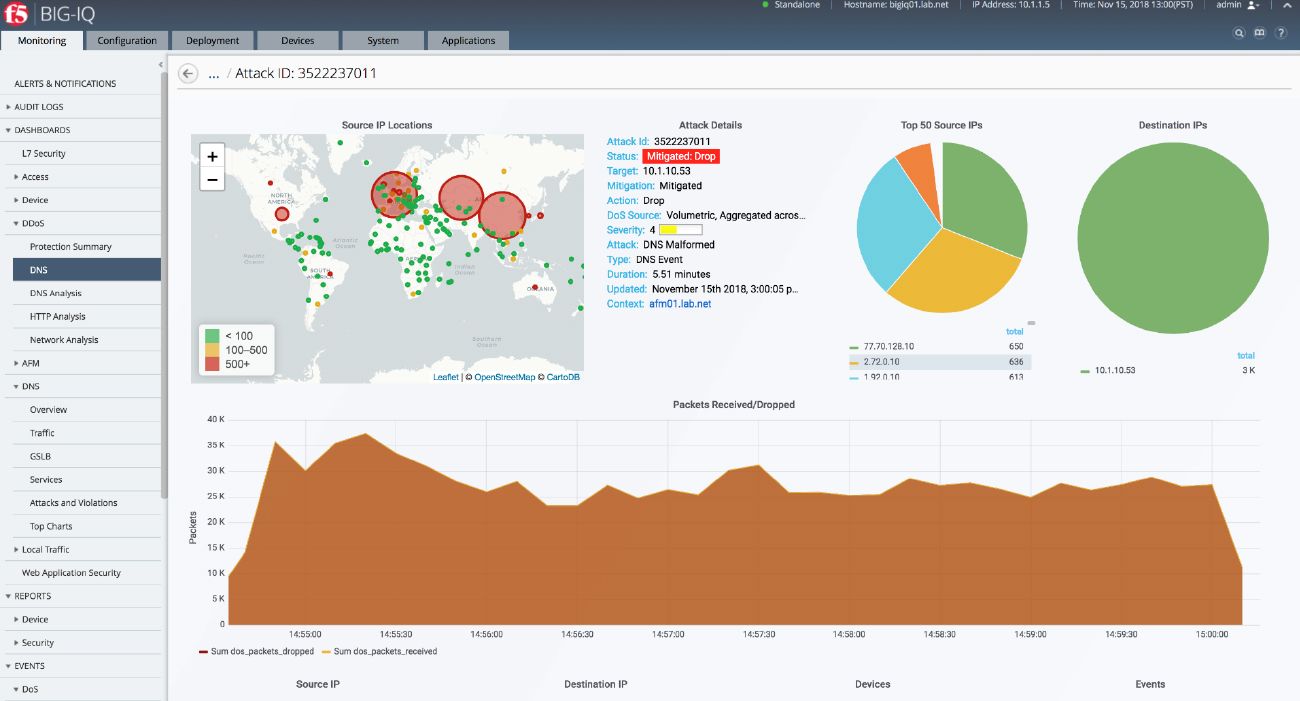 F5 BIG-IQ® Centralized Management is used to measure device health and investigate DDoS attacks. In Figure 1, DNS DDoS attack details can be observed by all managed F5 BIG-IP® products. It shows attack type, size, flow history, source and destination IP address, Geo IP map, and status. The Attack Type details show In/Drop requests (the amount of traffic that has been filtered); Status (whether the attack is ongoing or has been mitigated); Start/End Time (the event start and end date of the attack); and how much traffic has been observed by each BIG-IP module.