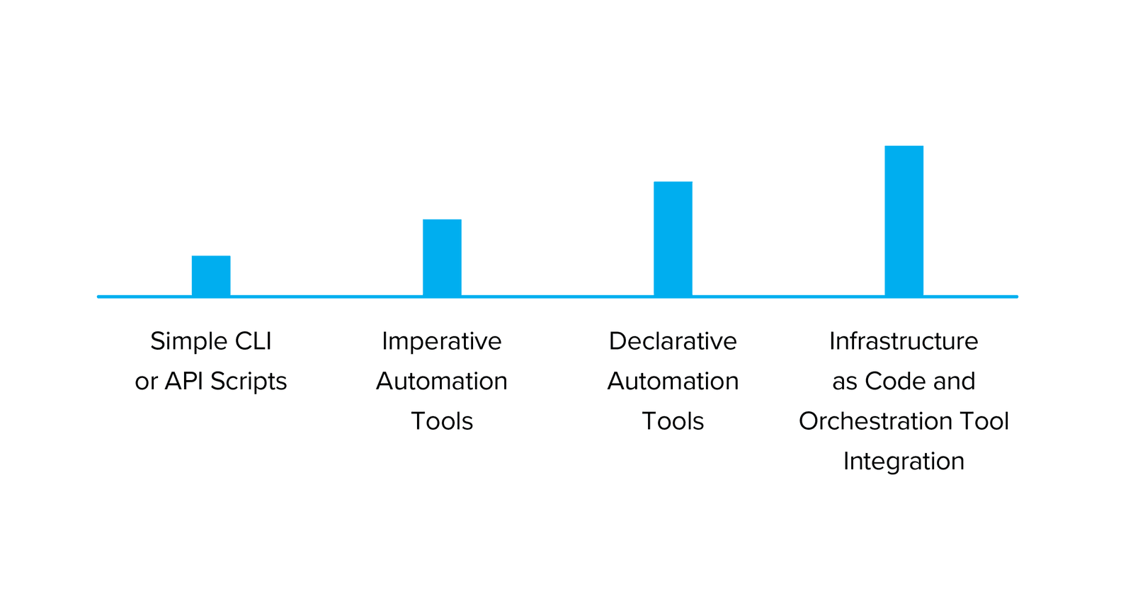 There are two conceptual models for how automation interfaces are exposed to consumers. The most common “first wave” automation schemas tend toward an imperative model. In imperative automation models, the automation consumer usually needs to know both what they want to achieve, and the explicit steps (usually by API calls) to achieve them. This often places the burden of understanding the configuration details of advanced services—as well as the additional complexity and effort to integrate the services with automation tools—on the consumer. It’s akin to asking for a sandwich by specifying every single operation required to make it, rather than just asking for a sandwich with the expectation that the sandwich maker will know the operations (and order of operations) needed to make one.