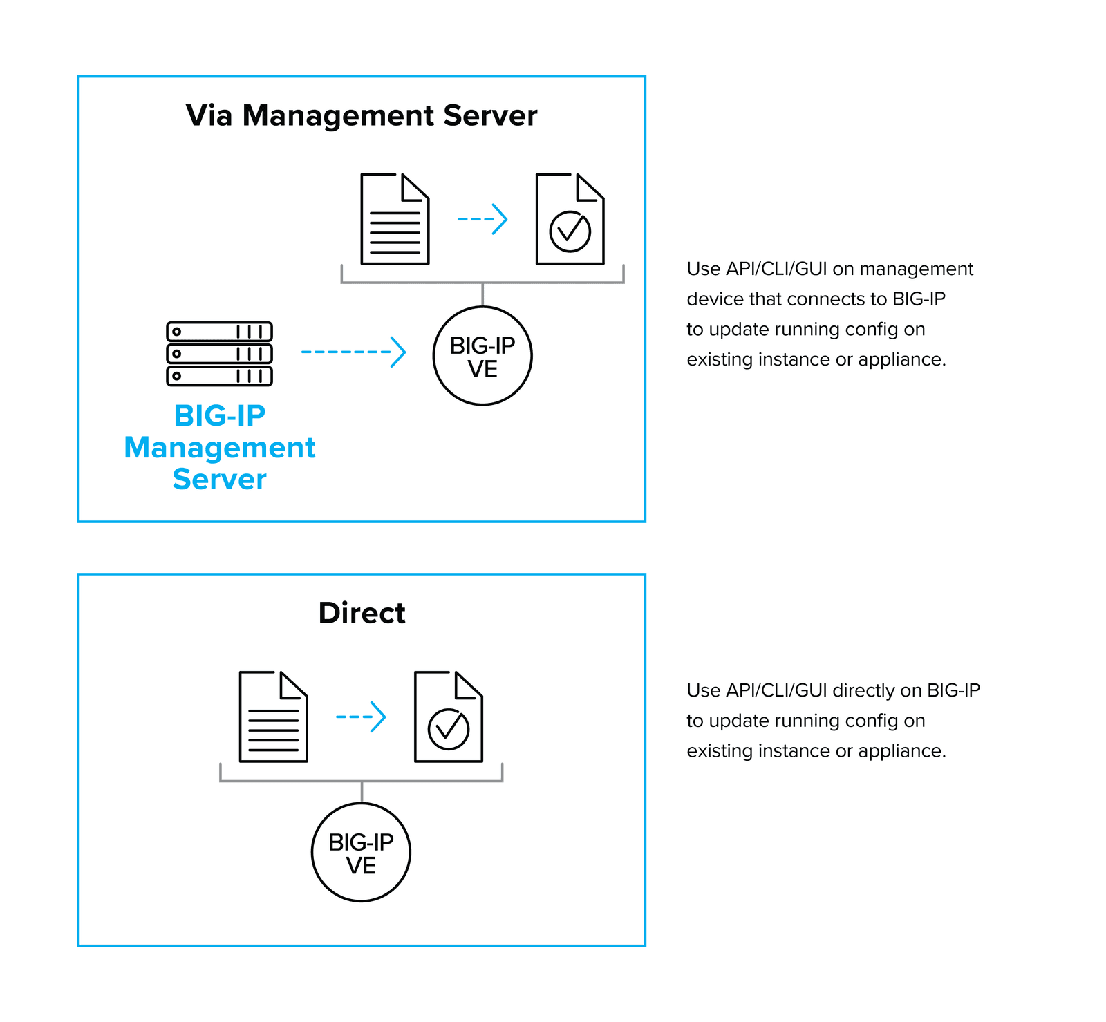 However, sometimes BIG-IP platforms are deployed as part of a discrete application stack, where the services of a particular BIG-IP are tied to a specific application or service. In this situation, we could treat the BIG-IP configuration as immutable; that is, the configuration is installed at boot, or as part of the software image, and is not changed during the lifecycle of the BIG-IP instance. Configuration changes are effected by altering the software image or startup agent script contents, and then redeploying. This model is often referred to as “nuke and pave.” While less common overall, the availability of new BIG-IP licensing models to support per-app instances, enhanced licensing tools, and tools like F5 cloud libs (https://github.com/F5Networks/f5-cloud-libs) (a set of Node.js scripts and libraries designed to help you onboard a BIG-IP in a cloud) are making this deployment model a viable option for organizations that require an application to have a tightly bound, isolated stack of both code and infrastructure.