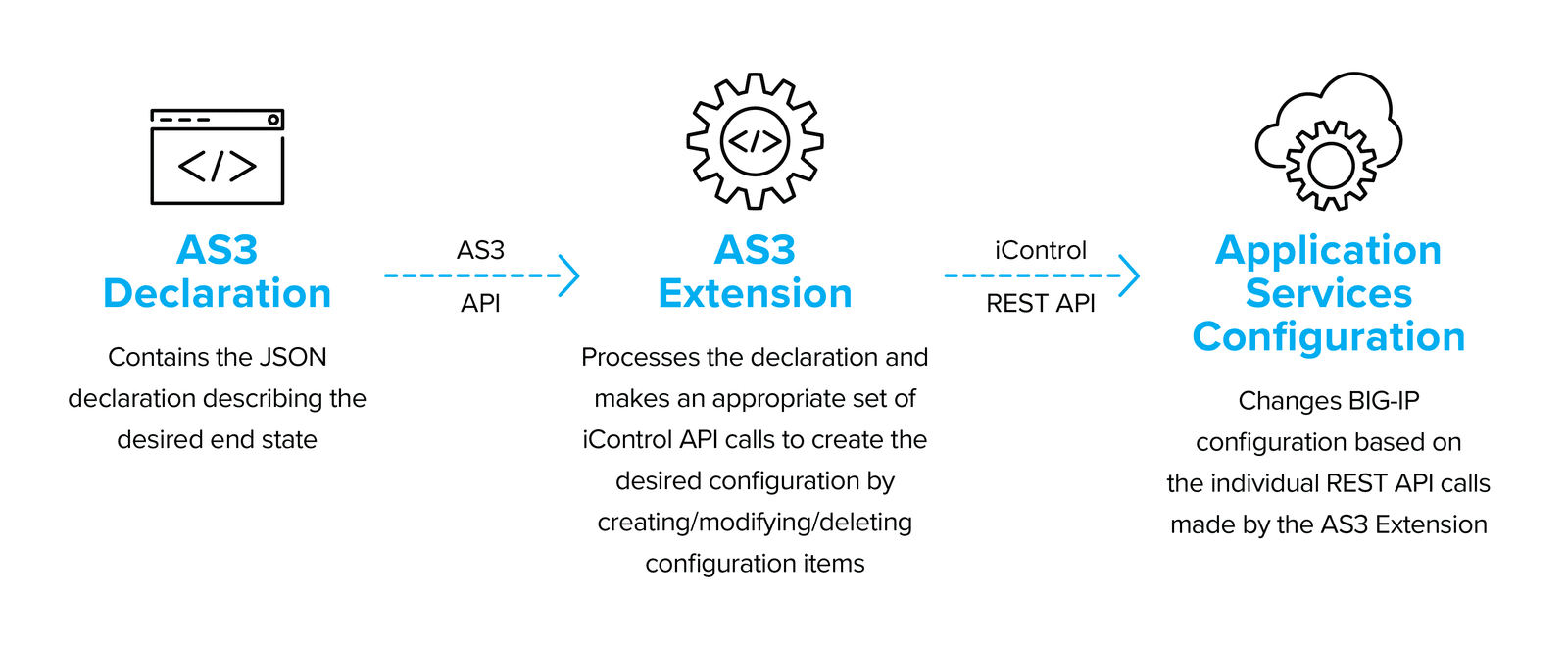 The F5 Applications Services 3 Extension (AS3) provides a simple and consistent way to automate layer 4-7 application services deployment on the BIG-IP platform via a declarative REST API. AS3 uses a well-defined object model represented as a JSON document. The declarative interface makes managing F5 application service deployments easy and reliable.
