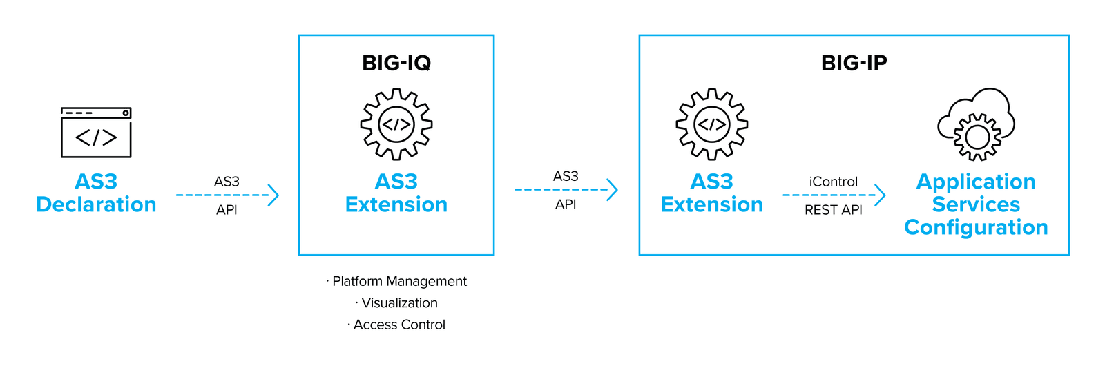 AS3 calls can also be made via BIG-IQ, which provides licensing, management, visualization, and access control for BIG-IP platforms, and powers the F5 Cloud Edition, which brings on-demand, per app instances of BIG-IP combined with powerful analytics.