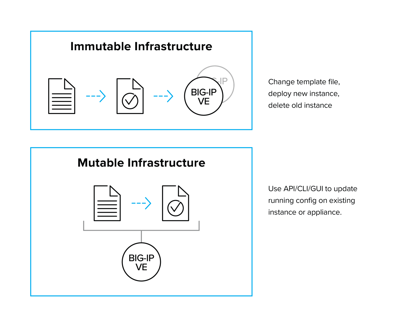 Most current BIG-IP deployments could be considered mutable, which means that we can expect their configuration to change over time. This is because the BIG-IP platform is mostly deployed as a multi-tenant device that supplies services to multiple applications. As new applications are deployed—or the existing applications scale or require additional services—the configuration of the BIG-IP will be updated to correspond. This method of deployment enables infrastructure teams to manage a set of centralized infrastructure, which supplies services to applications from a common platform.