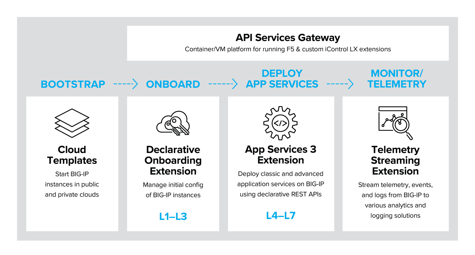 With tools like AS3, cloud templates, and Declarative Onboarding, you can store all the configuration information needed to build and configure Application services as part of a deployment pipeline.