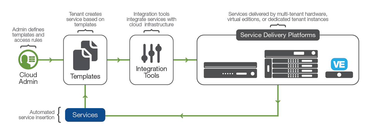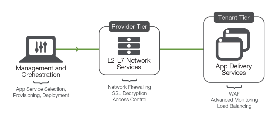 At the edge of the network, high-capacity, multi-tenant hardware deals with network firewalling, SSL decryption, access control, and network optimization. These general services are shared by all tenants and controlled centrally.