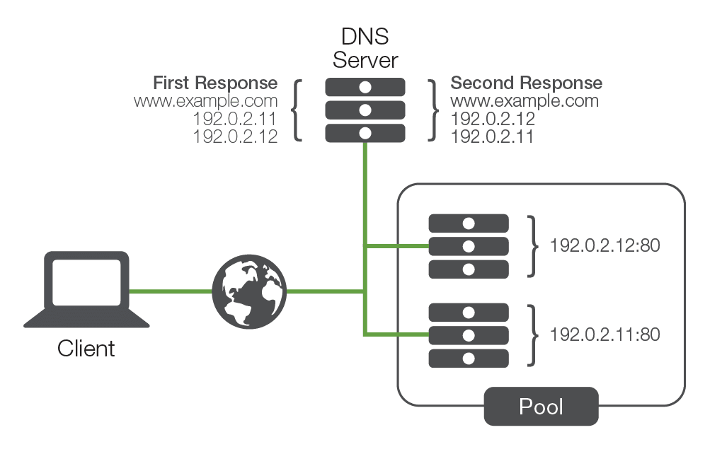 Under this method, the DNS would assign a number of unique IP addresses to different servers, under the same DNS name. This meant that the first time a user requested resolution for “www.example.com,” the DNS server would pass each new connection to the first server in line until it reached the bottom of the line—before going back to the first server again. This solution was simple and led to even distribution of connections across an array of machines.
