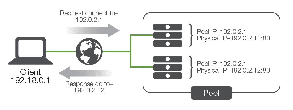 When users attempted to connect to the service, they connected to the pool IP instead of to the physical IP of the server. Whichever server in the pool responded to the connection request first would redirect the user to a physical IP address (either their own or another system in the pool), and the service session would start. One of the key benefits of this solution was that the application developers could use a variety of information to determine which physical IP address the client should connect to. For instance, they could have each server in the pool maintain a count of how many sessions each pool member was already servicing, then have any new requests directed to the least-utilized server.