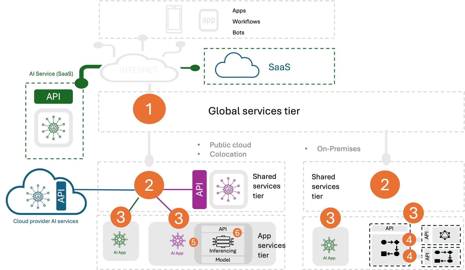 You may recall this post on AI inferencing patterns, in which we demonstrate the three main deployment patterns for AI inferencing today. Based on those patterns, we can identify six distinct insertion points in this expanded architecture for application services and identify where those services are best deployed to optimize for security, scale, and efficiency.