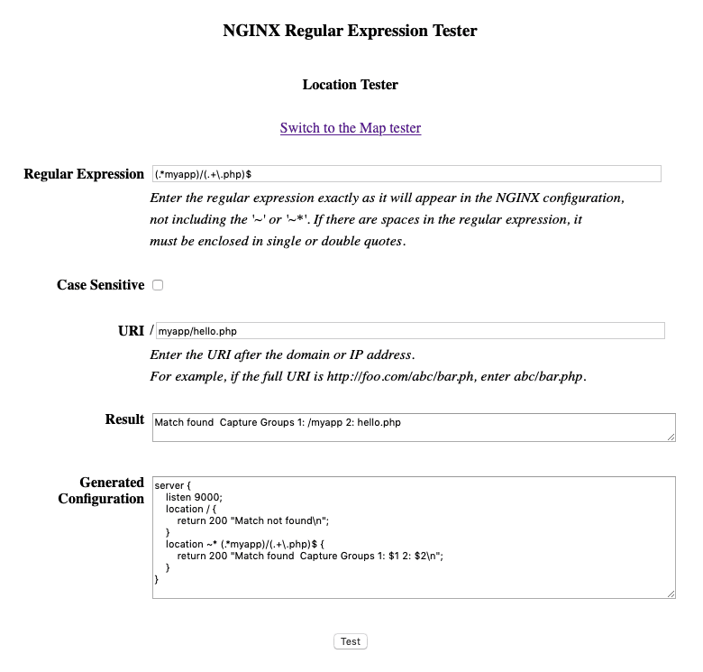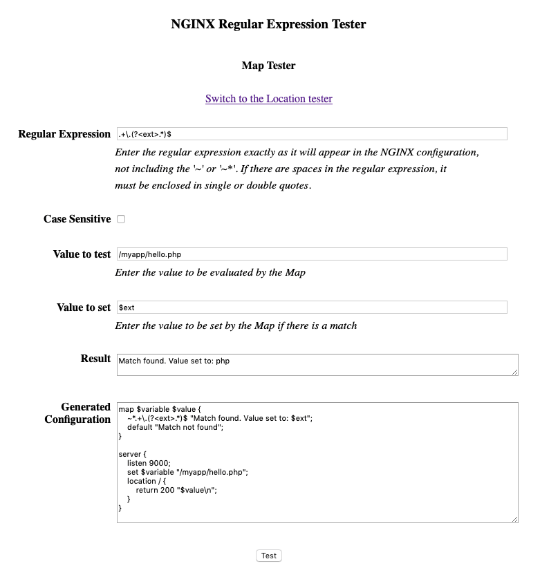 - The tester is intentionally designed to be as simple as possible and to fulfill one purpose: test regexes as written by the user, using the actual NGINX regex engine for maps and HTTP locations. As a consequence, you need to provide only a minimal amount of information to create a working NGINX config. We have no plans to add features (such as validating the regex before testing) because that would violate the guiding principle of simplicity. We are happy to fix bugs, of course; please submit them on the Issues tab at our GitHub repo.