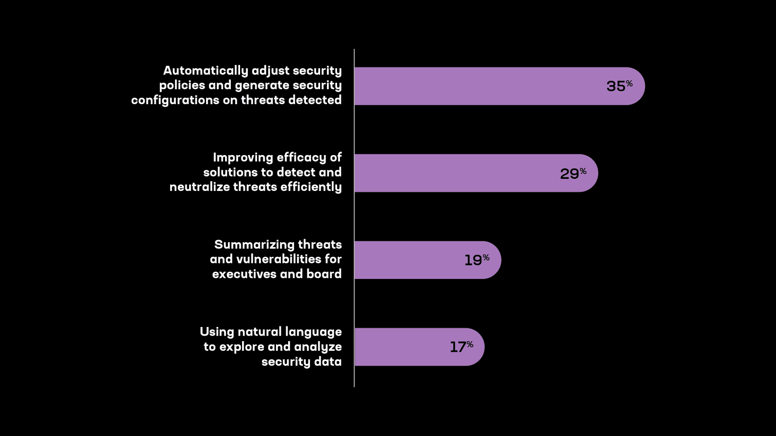 While operational complexity presents a barrier to automation, organizations are counting on generative AI to help, rating it the no. 1 most exciting trend of the year. Security is the top use case for generative AI, with 35% of respondents interested in using generative AI to automate policies and configuration tasks too complex to manage manually, and 29% wanting to use it to improve their ability to detect and neutralize threats.