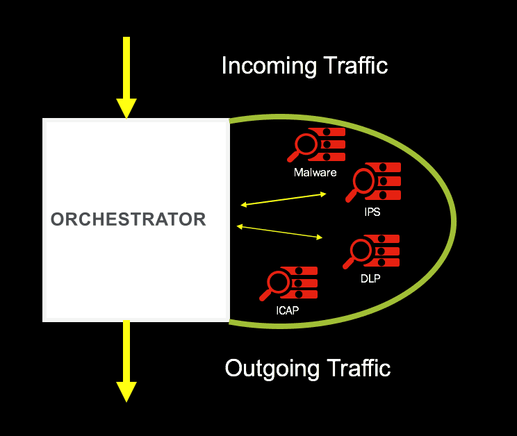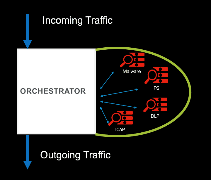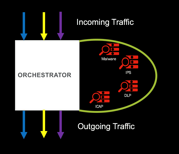 Today a typical enterprise stacks different kind of technologies as layers of defense and user traffic passes through it. Individually many security devices can cater for the traffic load, SSL/TLS offload, and the processing of all traffic, but the CPU cycles spent can be optimized and put to better use with intelligent orchestration.