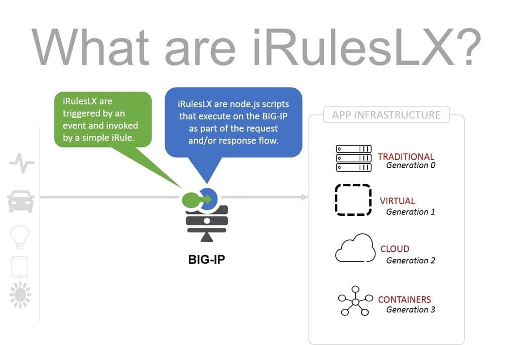 A quick overview/refresher on both: iRules are event-driven TCL scripts that execute on the BIG-IP as part of the request/response flow. iRulesLX are scripts that accomplish the same task but let you develop in node.js. They are triggered by a request or response event and invoked by a simple iRule.