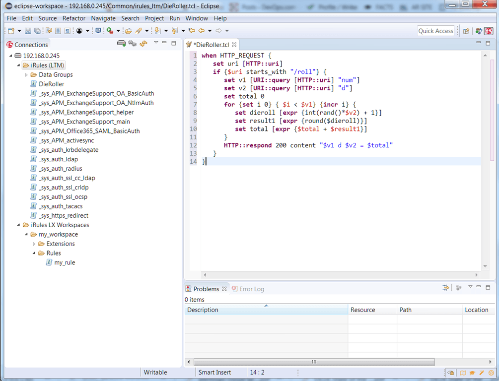 Whether you choose to develop in TCL or node.js, the Eclipse plug-in offers all the goodness of an IDE such as syntax highlighting and integration with repositories like git. The F5 plug-in provides an easy way to connect to a BIG-IP and retrieve, create, edit, and deploy both iRules and iRulesLX.