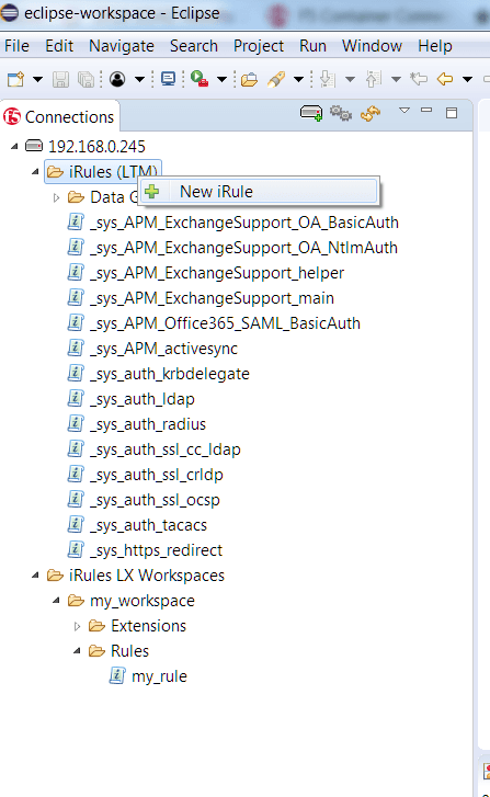 Once you’ve got it installed (and connected to a BIG-IP – on its management IP address) you’ll get a list of all existing iRules and iRuleLX workspaces.